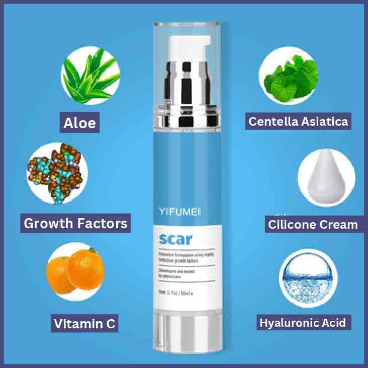 Aloe Vera, Hyaluronic Acid, Vitamin C, Growth Factors, Silicone Cream, Centella Asiatica.